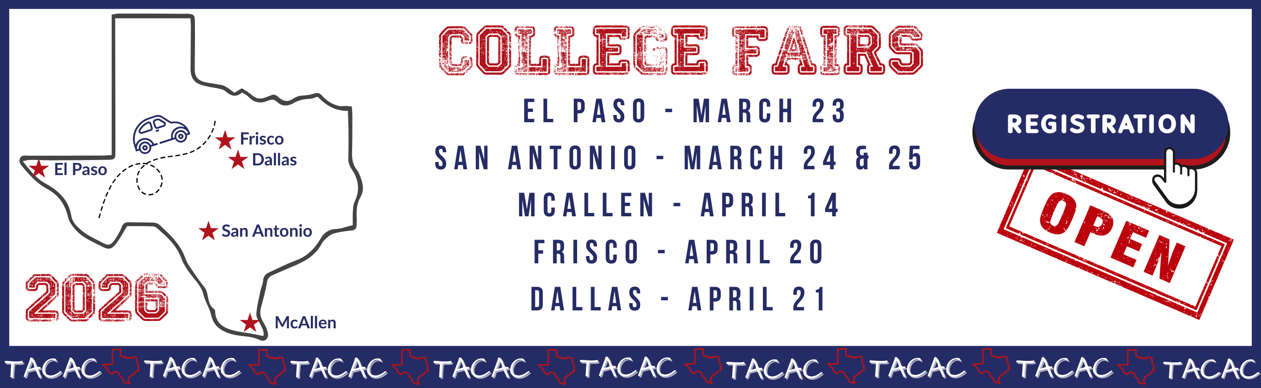 College Fair Locations: El Paso, San Antonio (2 fairs), McAllen, Frisco, and Dallas.
